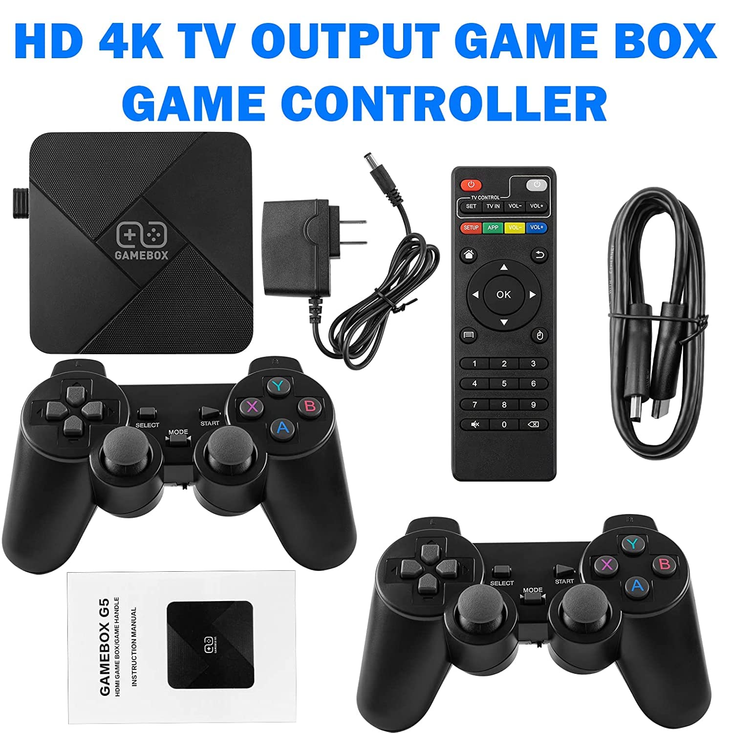 Package Contents: Game console*1 Wireless controller*2 Controller receiver*1 HD cable*1 TV remote control*1 Power adapter*1 64GB TF card*1 Conversion head*1 User manual*1 Tips: As the operation of the game system requires shortcut keys, it is recommended that you read the manual carefully before use. Note? Press the X button on the gamepad and you can search for the game you want.